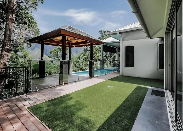 Cette villa Rainforest Retreat - Pool W Stunning Views Bayview Heights dispose d'une terrasse avec vue sur le jardin, ainsi que d'une piscine privée.